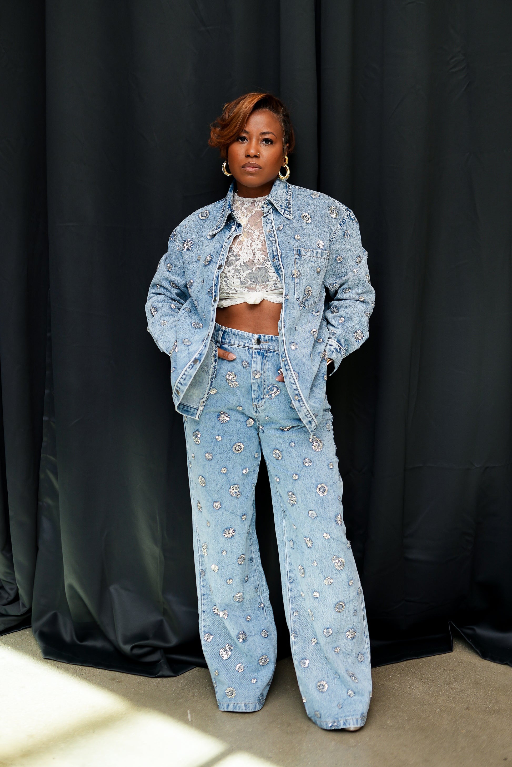 Make a dazzling entrance with the Sparkle Denim Set from Golden Chic. Covered in sparkling floral embellishments, this two-piece combines laid-back comfort with standout style. Effortlessly chic, it transforms everyday denim into a glamorous Golden Chic statement.
