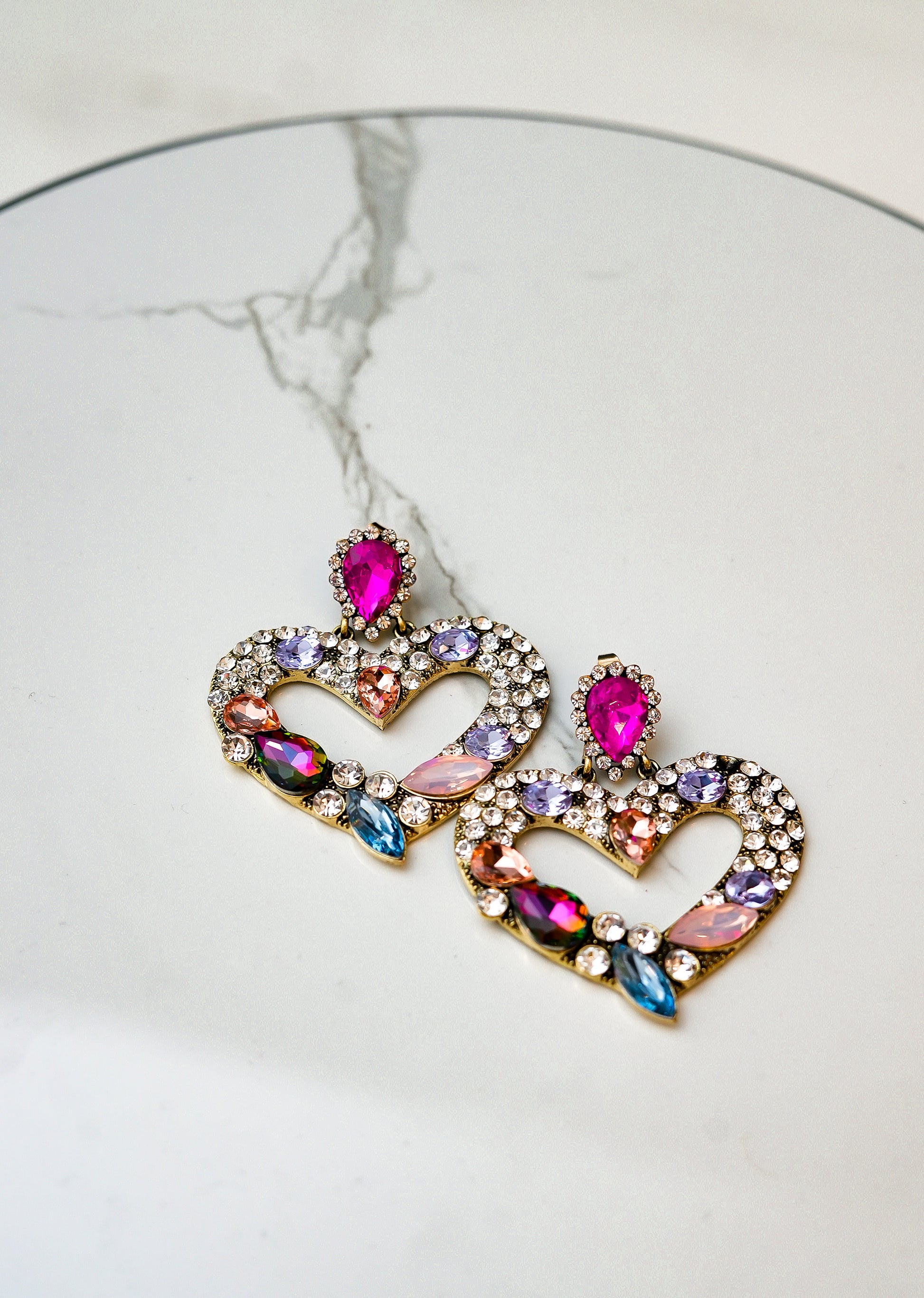 Shining brightly with multi-colored rhinestones, our Heart Embellished Earrings will make your heart flutter every time you slip them on! Give your ootd some extra sparkle with these incredible heart shaped drop earrings!