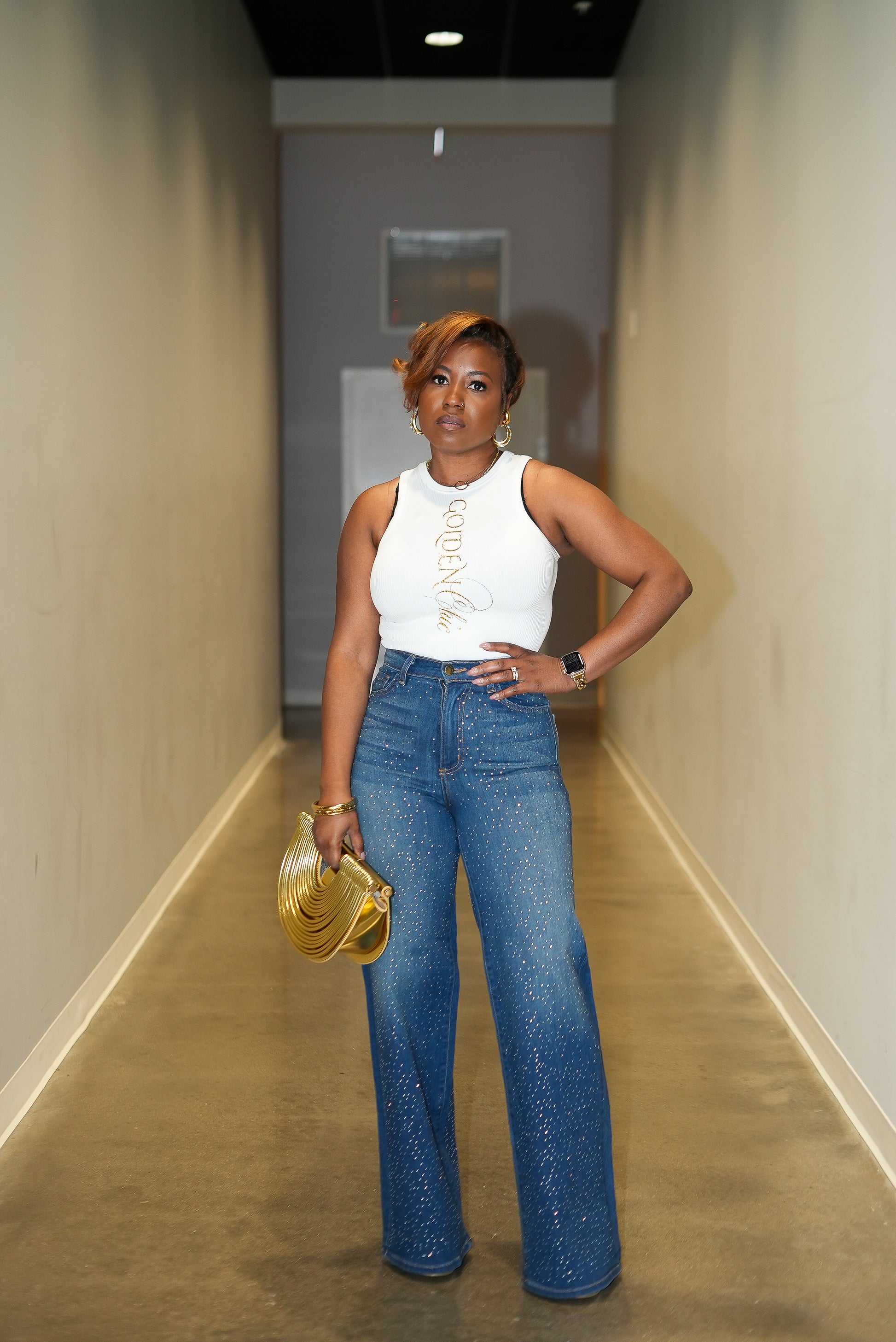 Step into sparkle season with Starstruck Denim from Golden Chic. These high-waisted, wide-leg jeans dazzle with rhinestones for a bold, shining look. Perfect to mix and match, they bring out your inner Golden Chic Babe effortlessly.
